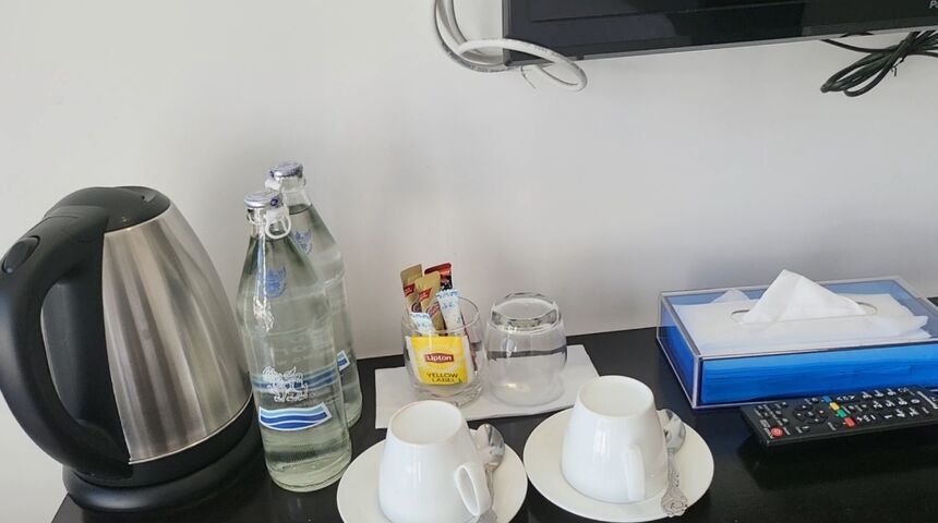作業テーブルの上にはポットとコーヒー紅茶のセットと、何気に嬉しいのはトイレットペーパーではなく、ちゃんとした(笑)ティッシュ。