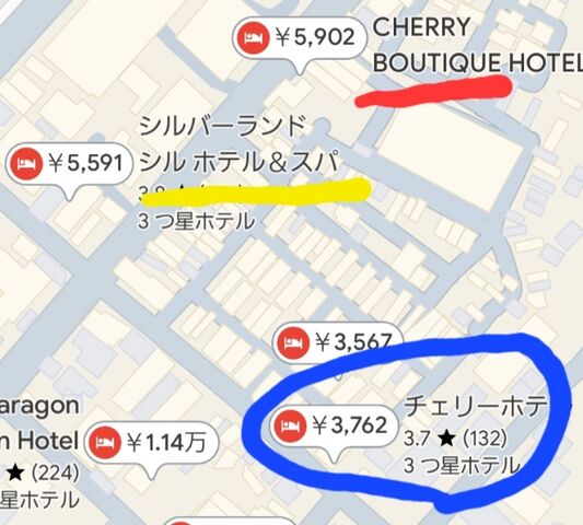 それから黄色のマークが以前レポートしたシルバーランドシルホテルになります。