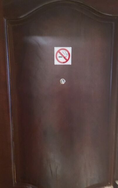 フロント:「ホテルは全室禁煙です。タバコは外の灰皿の所で」