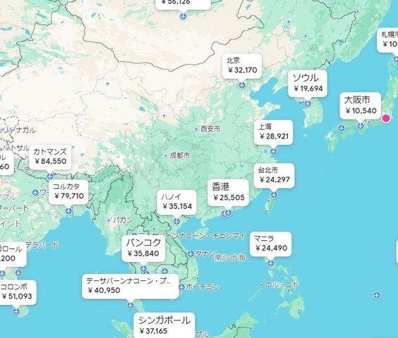 こうして出発地だけを入れて検索すると世界各地の出発地からの航空券最安値が一覧で見ることができます。
